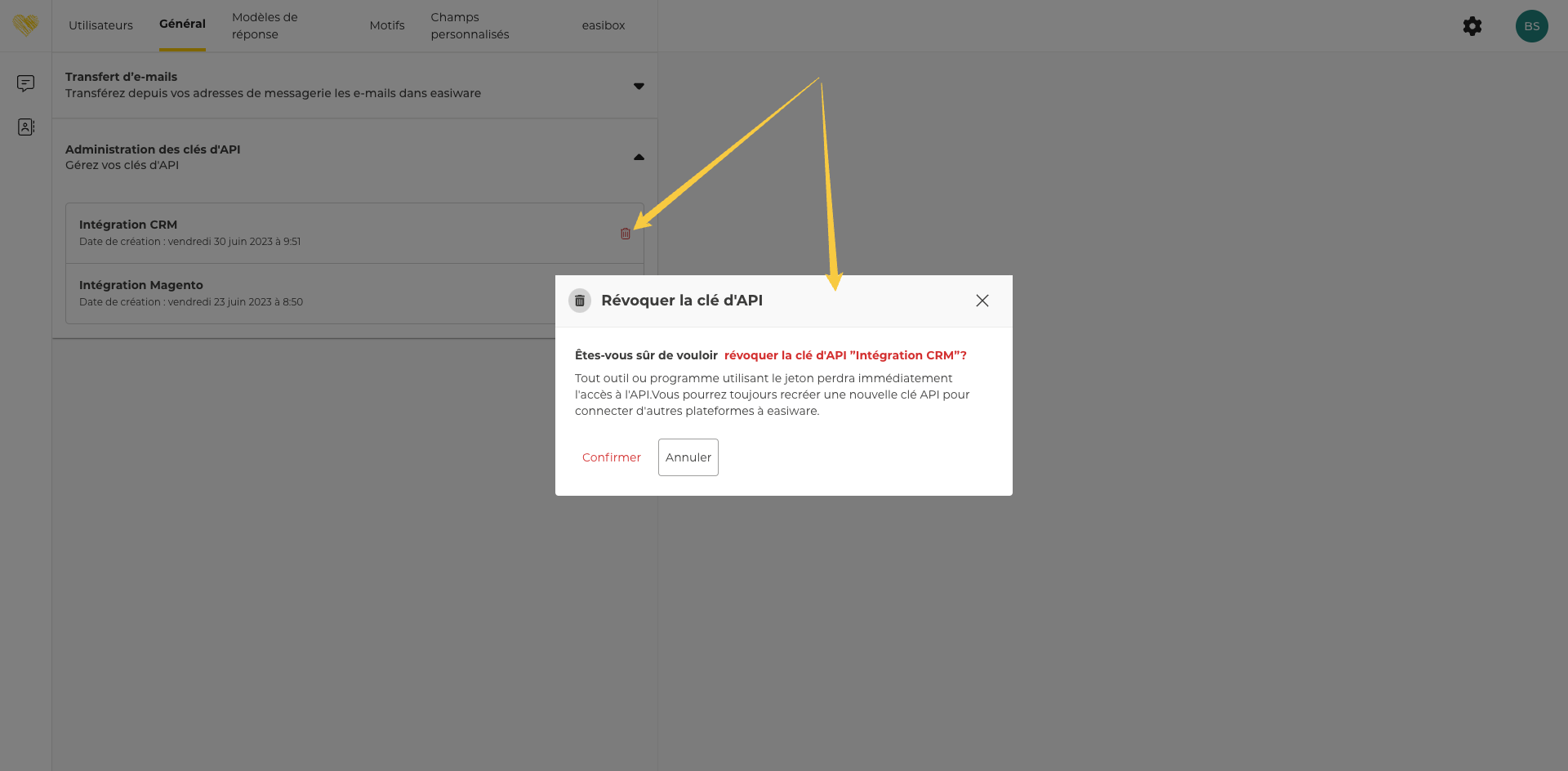 Afin de supprimer une clé d’API, il suffit de cliquer sur le bouton d’action dédié. L’administrateur sera invité à confirmer son action.
