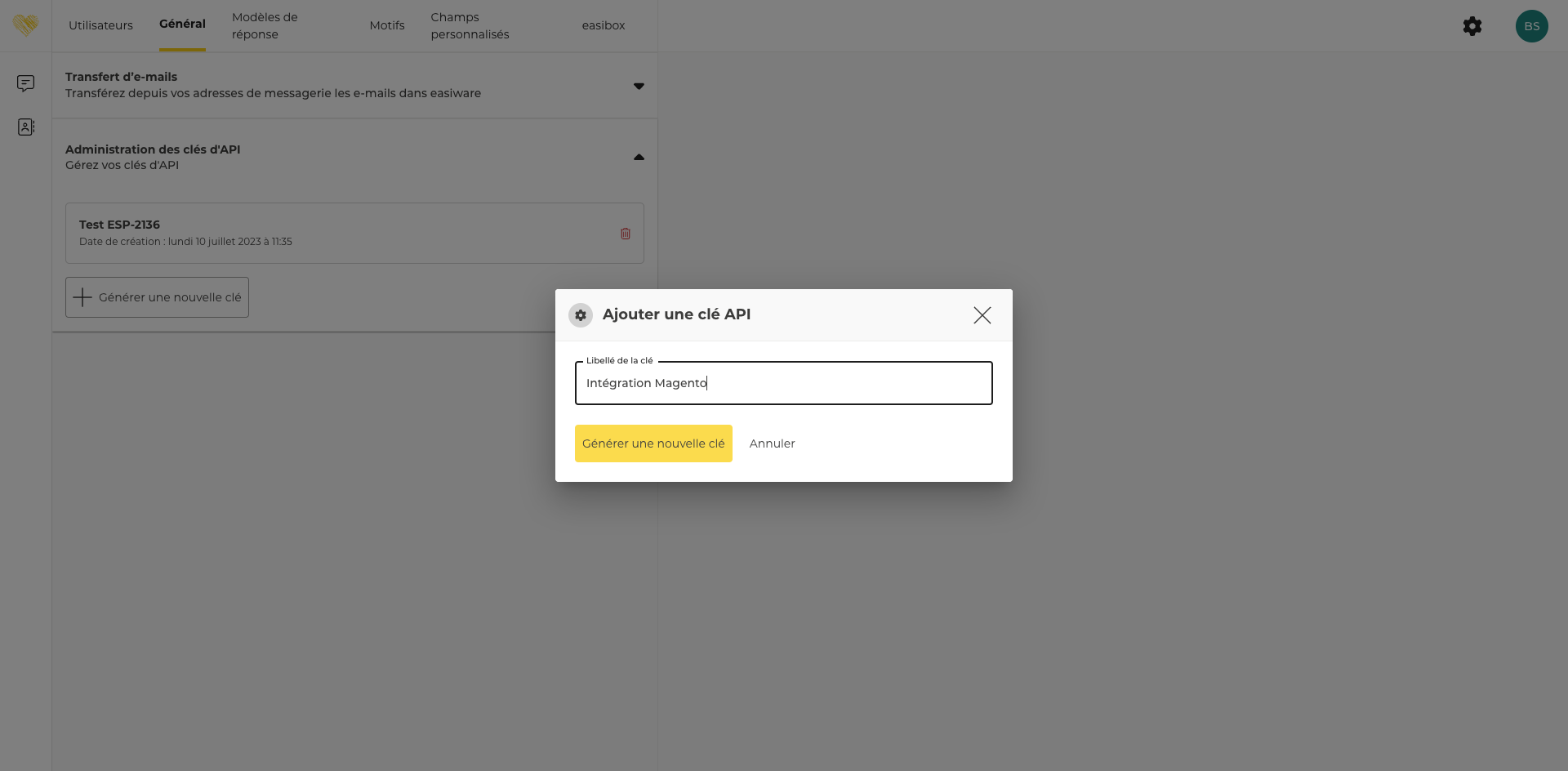 Il est possible de générer une clé d’API en cliquant sur le bouton d’action dédié.