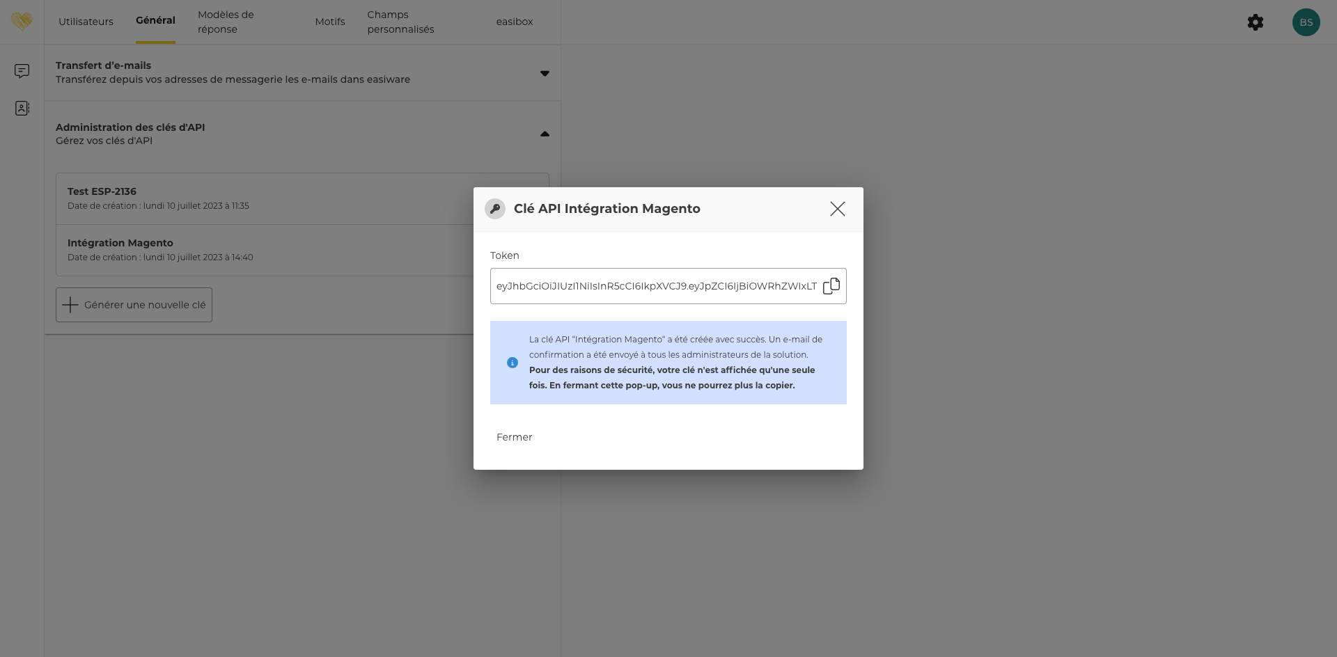 Pour des questions de sécurité, le token ne peut pas être retrouvé. Si cette valeur n’est pas sauvegardée par l’administrateur dans un espace sécurisé de son choix, ce dernier devra révoquer la clé d’API, générer une nouvelle clé d’API et remplacer l’ancienne par la nouvelle dans les TOUTES les intégrations où elle est utilisée.