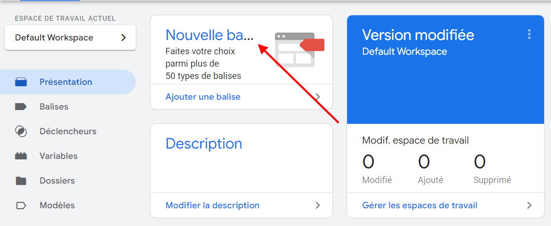 1. Rendez vous dans votre espace de travail GTM et cliquez sur le bouton d’action Nouvelle balise.