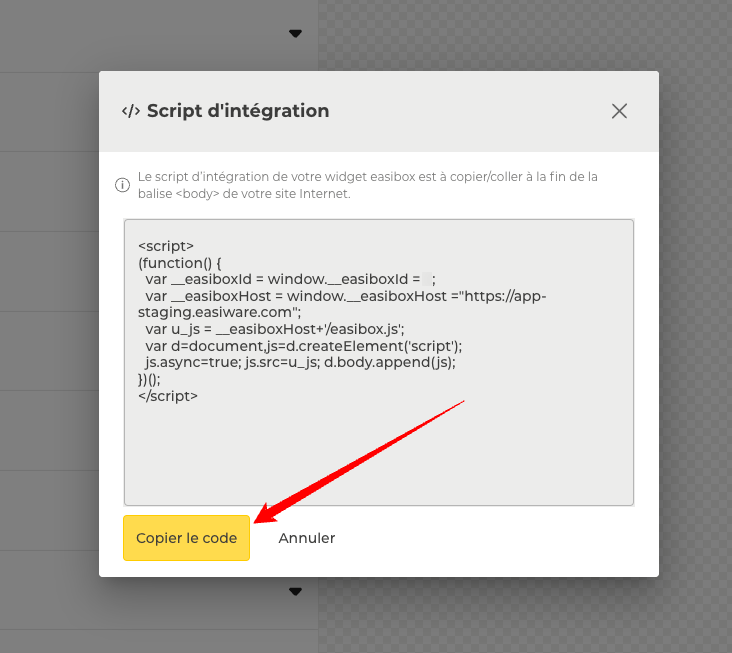 Cliquer sur le bouton d’action Script d’intégration afin d’afficher la popup contenant le script d’intégration de votre easibox.