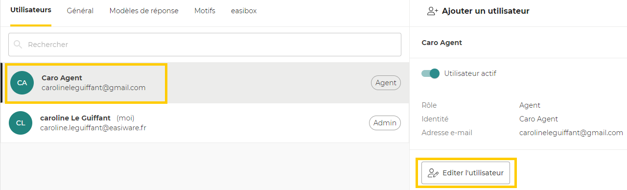 Si vous souhaitez passer un utilisateur d’un rôle Agent à un rôle Admin, il suffit de cliquer sur le nom de l’agent dans la partie utilisateur et de cliquer sur “éditer l’utilisateur” :