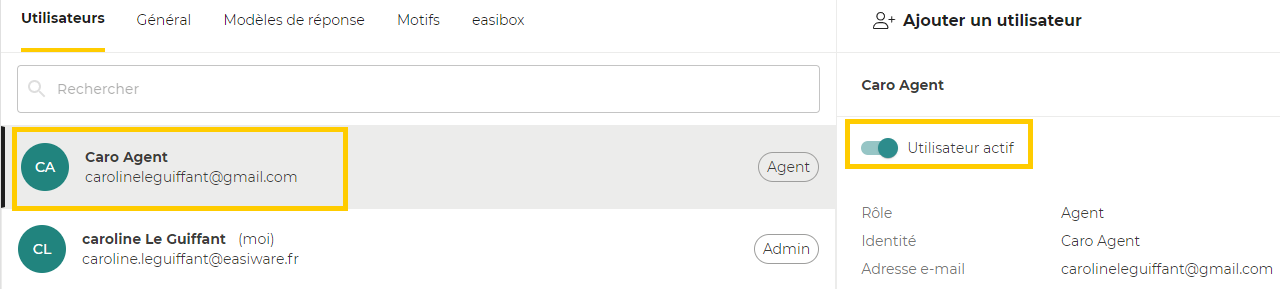 Si vous souhaitez désactiver un utilisateur, cliquez sur son nom et cliquez sur “utilisateur Actif” :