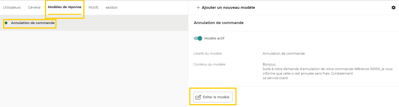 Si vous souhaitez désactiver un modèle de réponse, cliquer sur le modèle et faites glisser le switch sur la gauche :