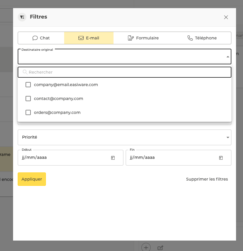 Via le champ Destinataire original, disponible dans la popup, il est possible de filtrer les demandes en fonction de l’adresse e-mail sur laquelle l’e-mail a été originellement envoyé (si un transfert automatique d’e-mails a été activé à un moment donné ou un autre).