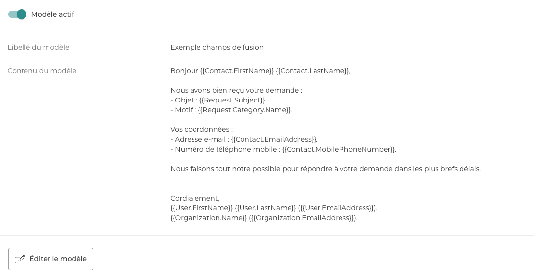Pour de plus amples informations à ce sujet et pour connaître la liste des champs de fusion supportés, n’hésitez pas à consulter la documentation dédiée → Les modèles de réponse | Utilisation-des-champs-de-fusion.