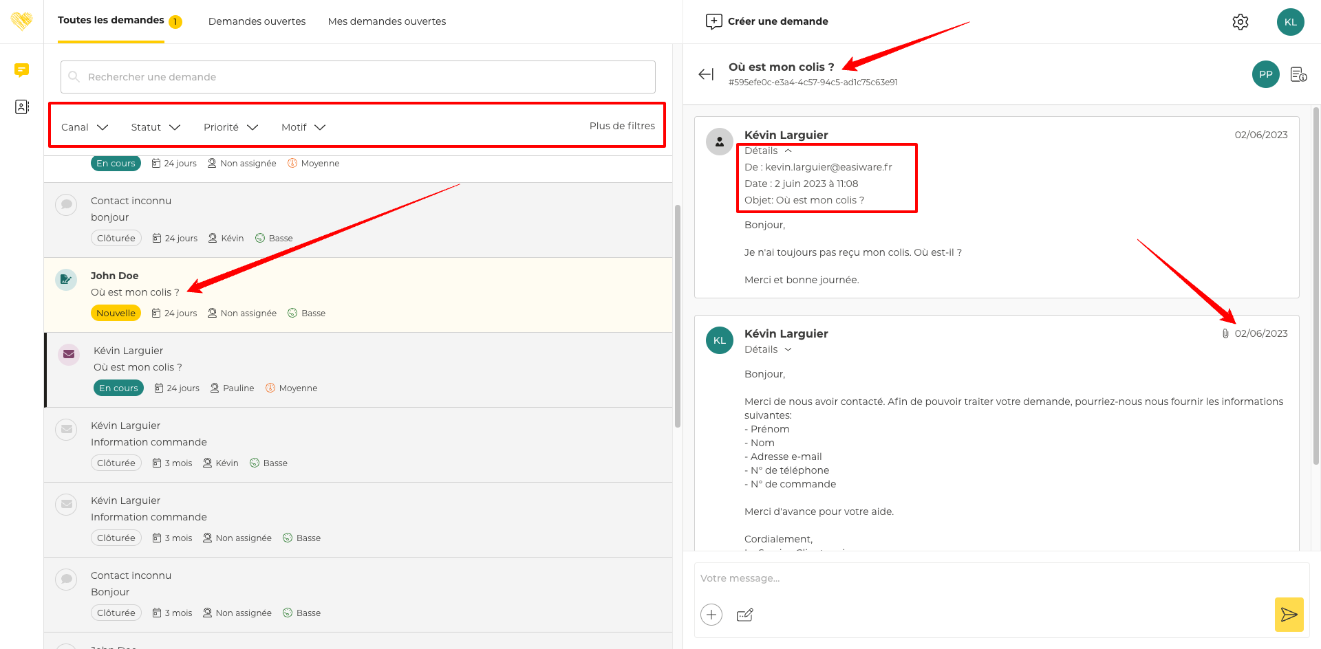 L’en-tête d’une demande contient dorénavant l’objet de cette dernière en lieu et place du nom du contact (qui reste visible dans la liste, les messages de la demande, les détails de la demande).