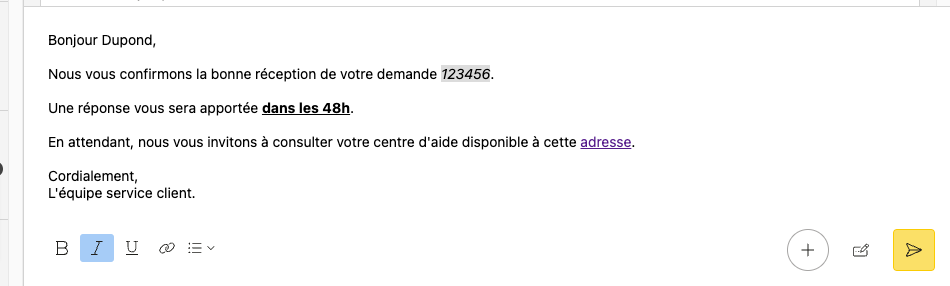 Avec l’intégration de l'éditeur HTML TinyMCE dans notre application, il vous est maintenant possible de formater votre e-mail sortant à destination du contact de la demande !