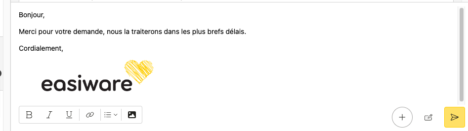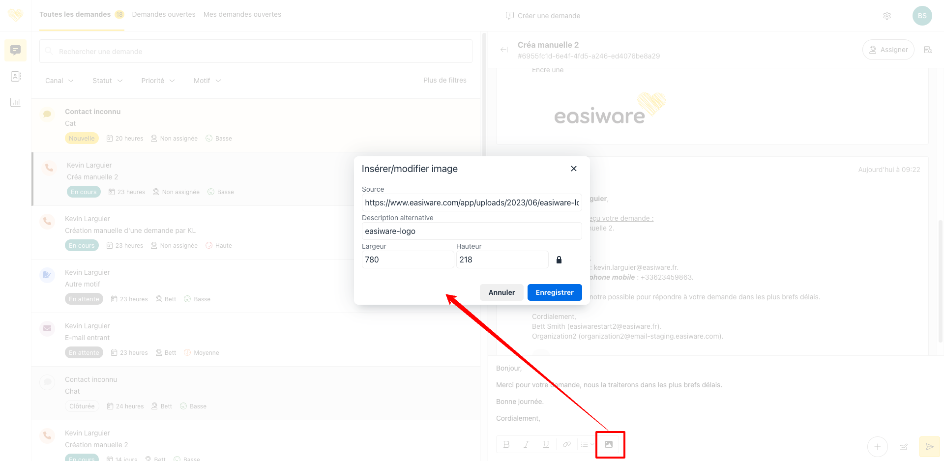 Après vous avoir donné la possibilité de mettre en forme votre message sortant depuis le traitement d’une demande grâce à l’intégration de l'éditeur HTML TinyMCE (voir v1.16), il est vous est maintenant possible d’insérer des images “inline” (dans le corps de votre message) en fournissant l’URL de cette dernière.