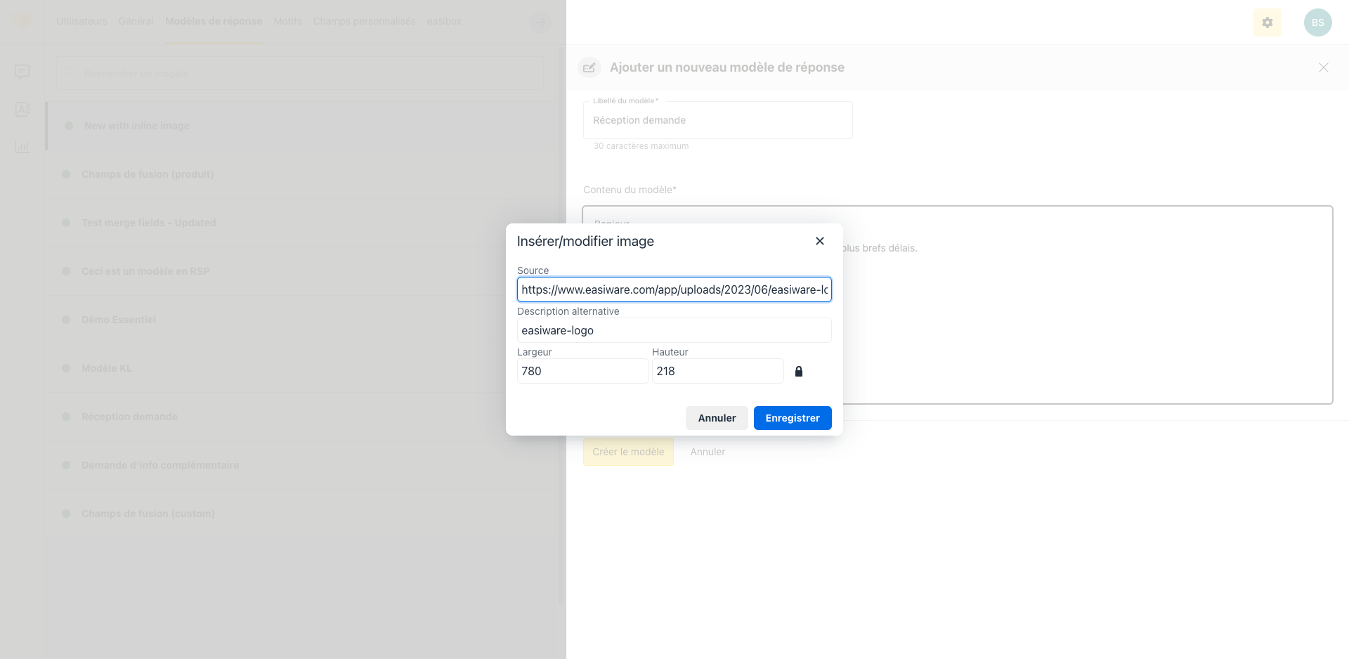 Insertion d’une image “inline” lors de la création d’un modèle de réponse