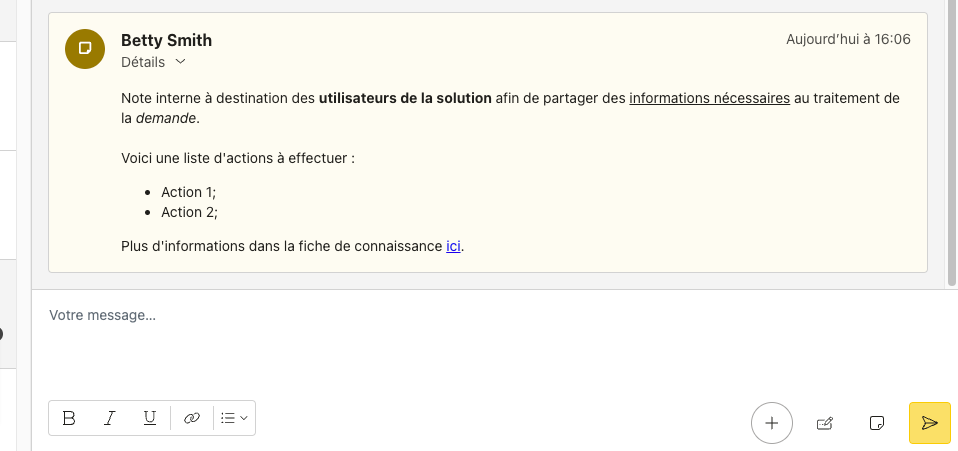 Pour cela, il suffit simplement de passer en mode “rédaction d’une note interne en cliquant sur le bouton d’action dédié.