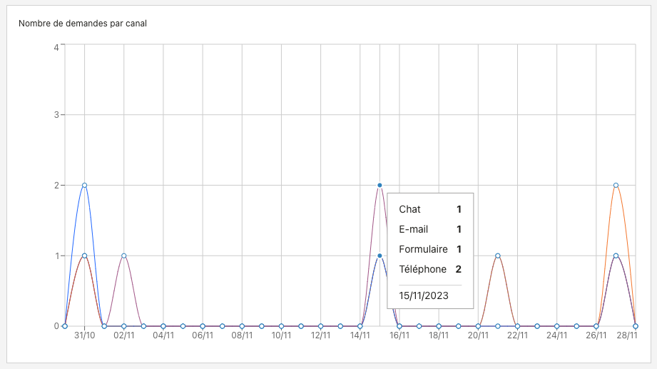 Afin de vous permettre de visualiser les canaux sur le ou lesquels vous êtes le plus sollicité ainsi que la tendance sur les 30 derniers jours, nous avons ajouté dans la page Performances un nouveau graphique permettant de visualiser le nombre de demandes par canal (e-mail, formulaire Web, chat, téléphone) et par jour.