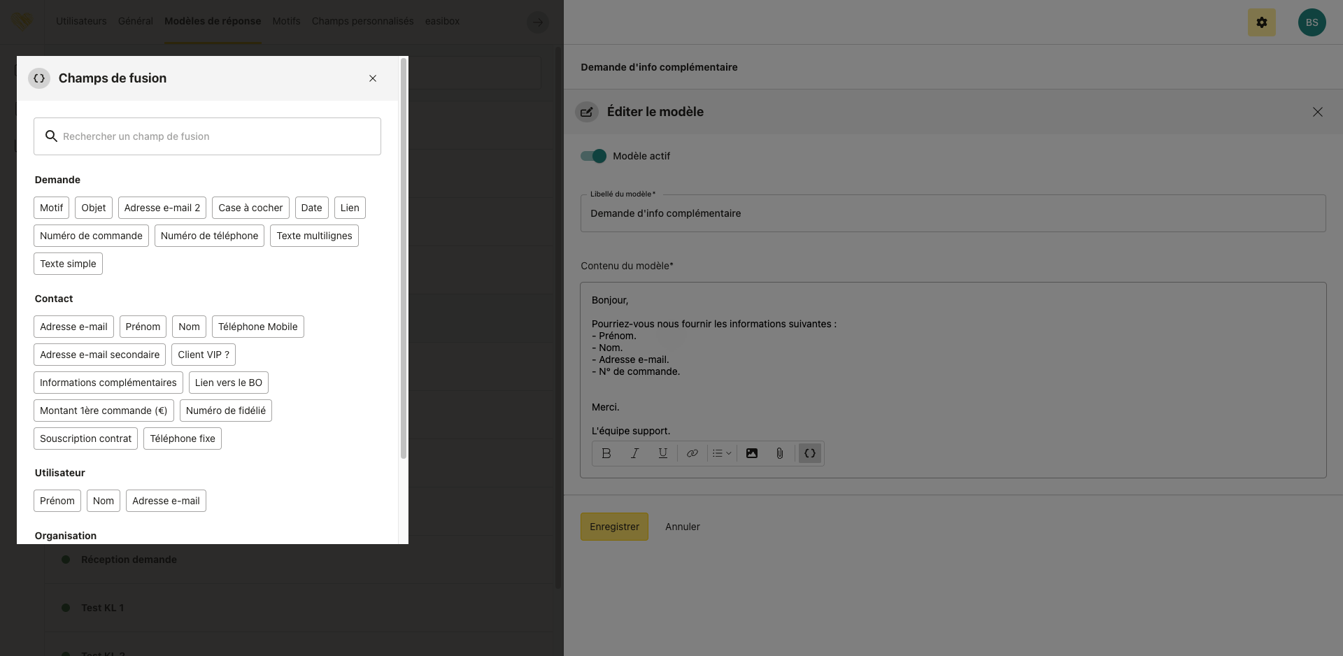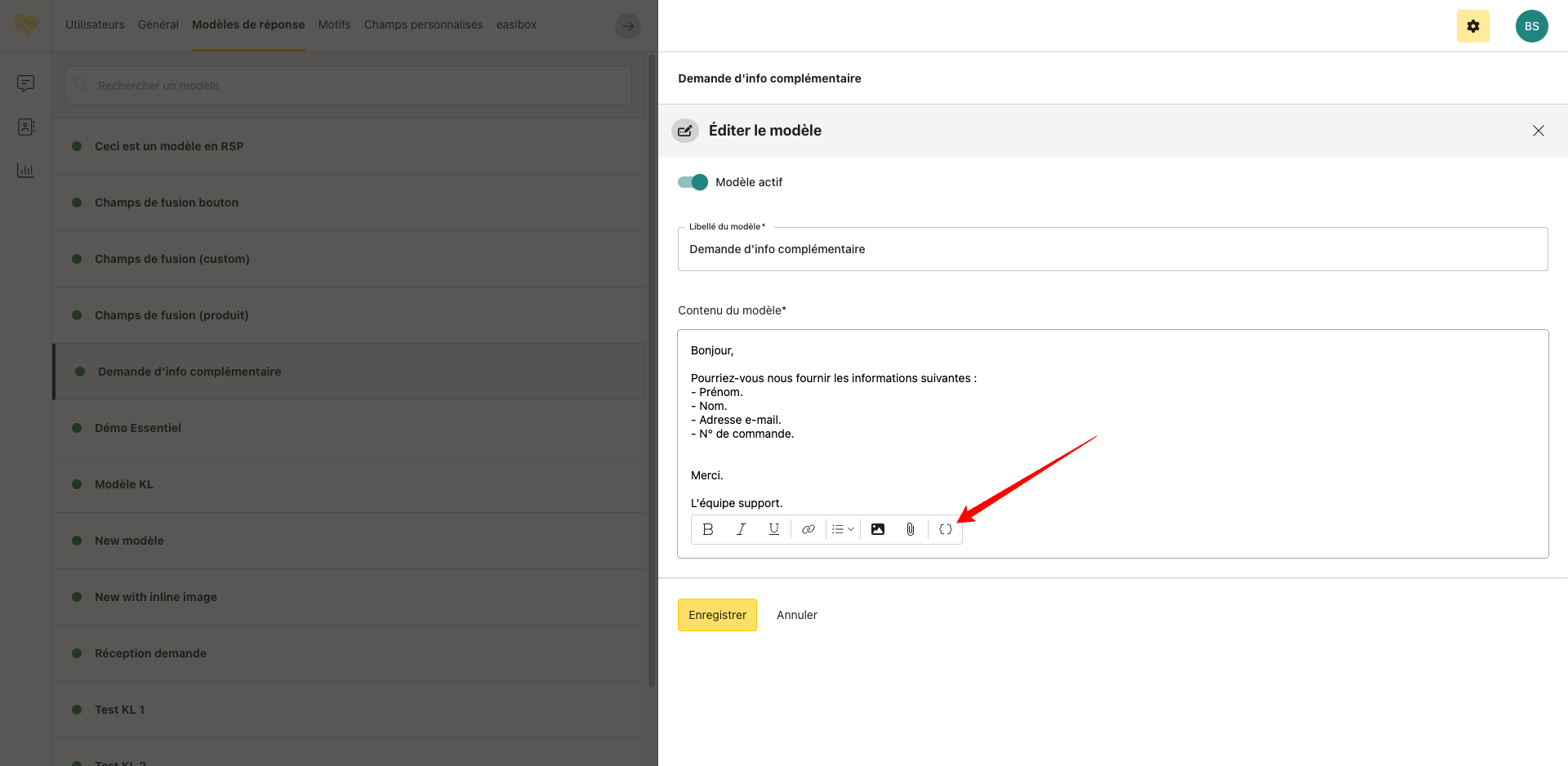 En cliquant sur un champ de fusion, la variable correspondante est automatiquement insérée dans le corps du modèle de réponse.