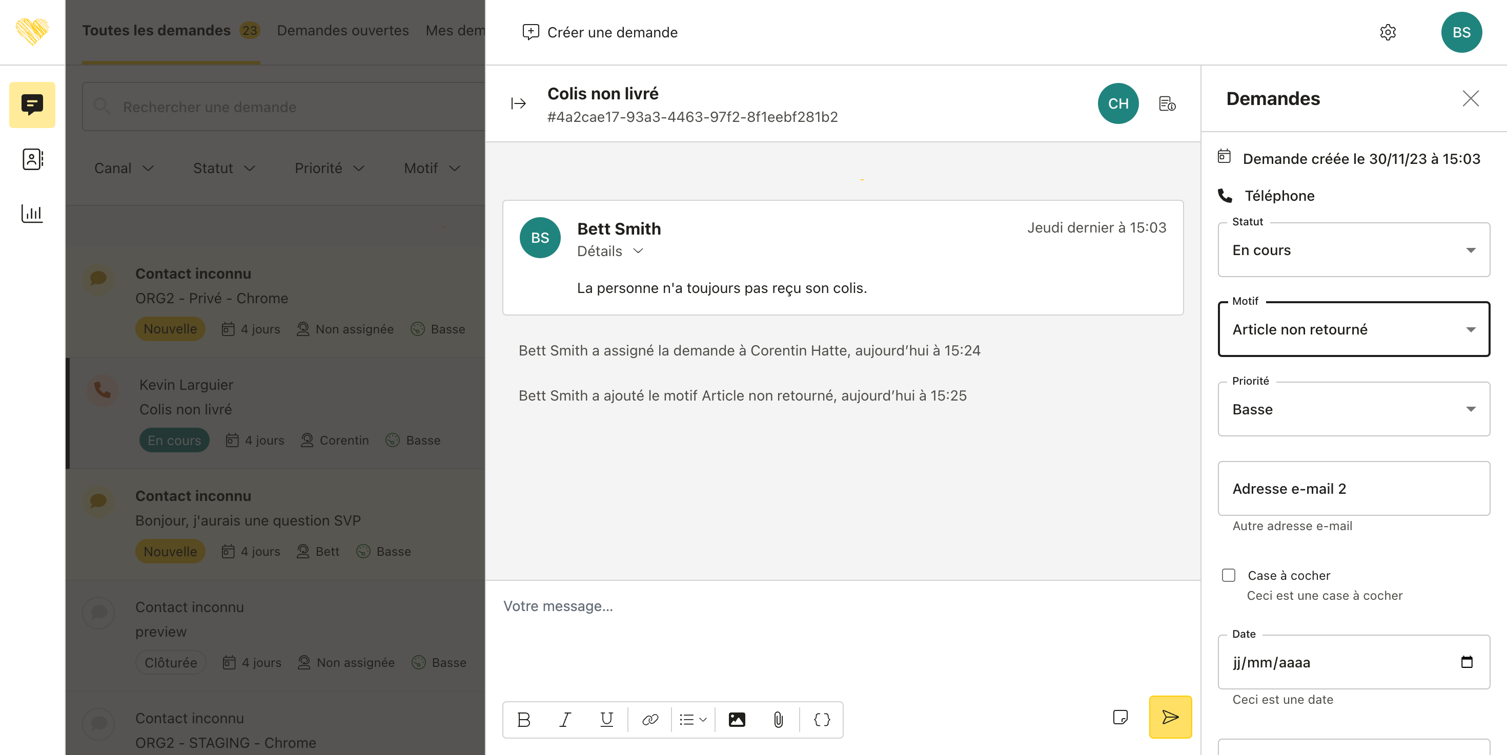 Dans l’objectif de partager des informations nécessaires au traitement d’une demande, d’historiser des actions utilisateurs ou tout simplement contextualiser cette dernière, il vous est maintenant possible de rédiger une note interne qui sera sauvegardée sur la demande.
