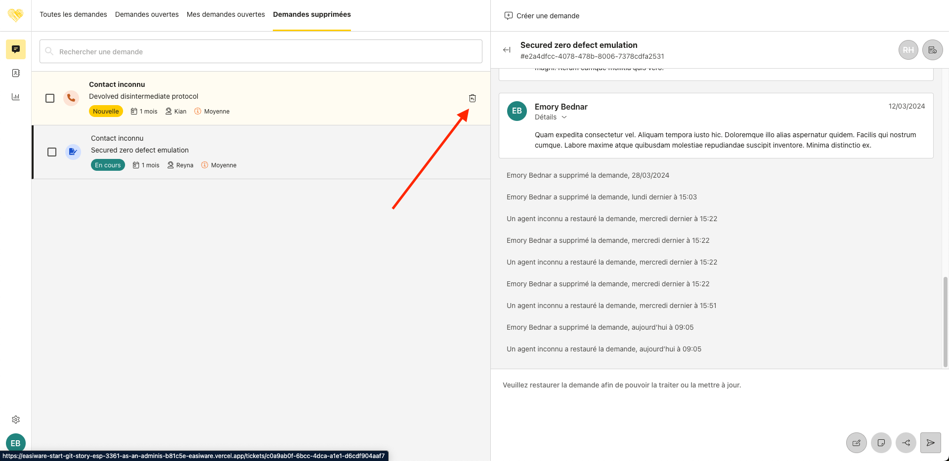 Seuls les utilisateurs possédant le rôle Admin peuvent accéder aux demandes supprimées et les restaurer.