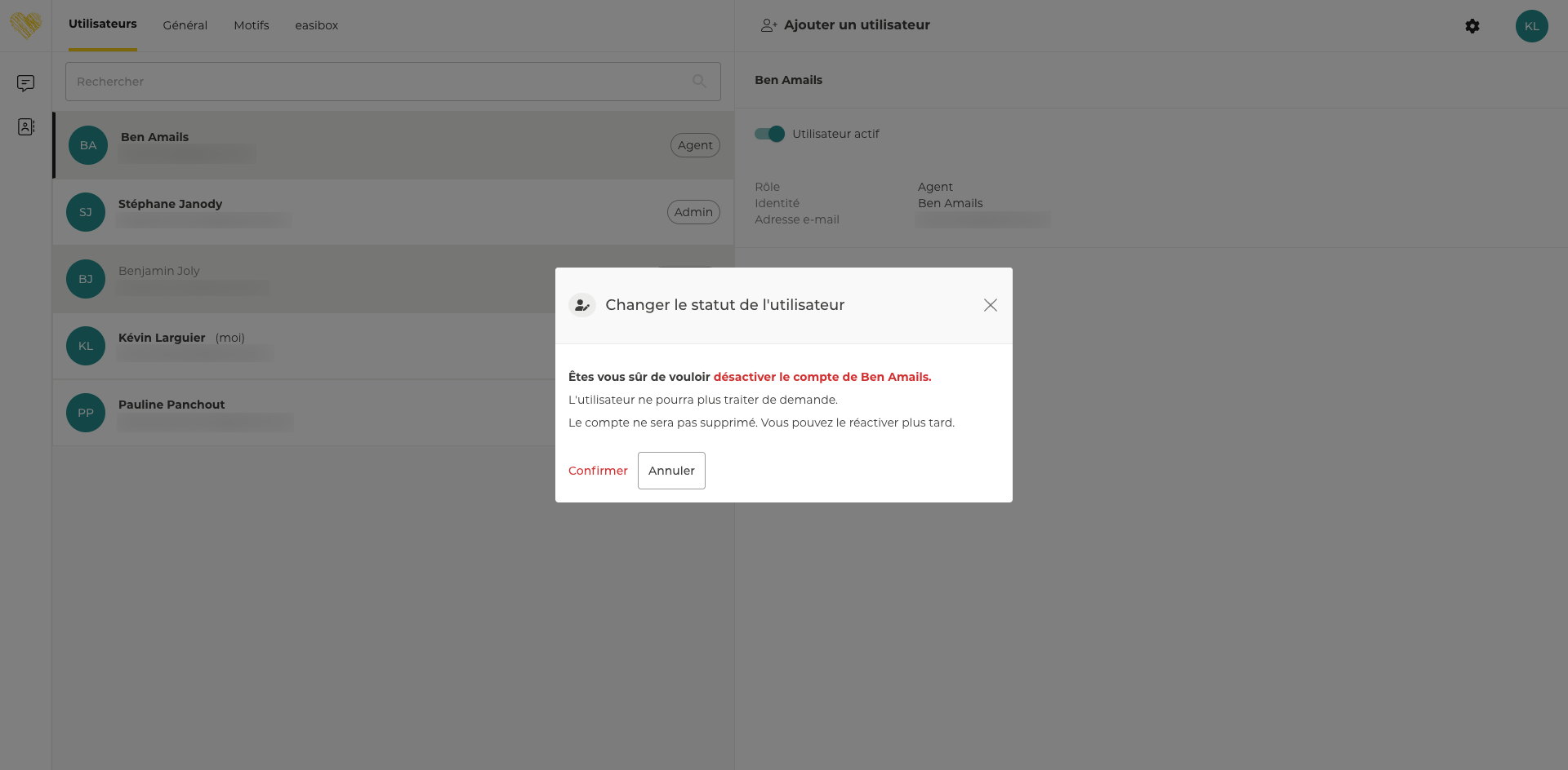 Afin d'éviter toute erreur de manipulation dans l’administration des utilisateurs de l’application, lorsqu’un administrateur souhaite désactiver un utilisateur, il est invité à confirmer son action via l’affichage d’une popup dédiée.