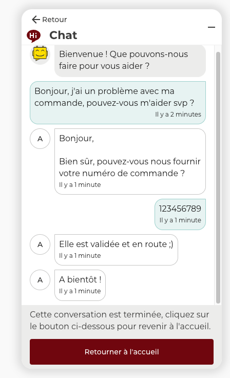 La conversation est clôturée côté contact : il n’est plus en capacité d’envoyer un message dans la conversation et est invité à retourner sur la page d’accueil de l’easibox via un bouton d’action dédié. Il sera alors en capacité de démarrer une nouvelle conversation chat (ce qui créera une nouvelle demande côté utilisateur).