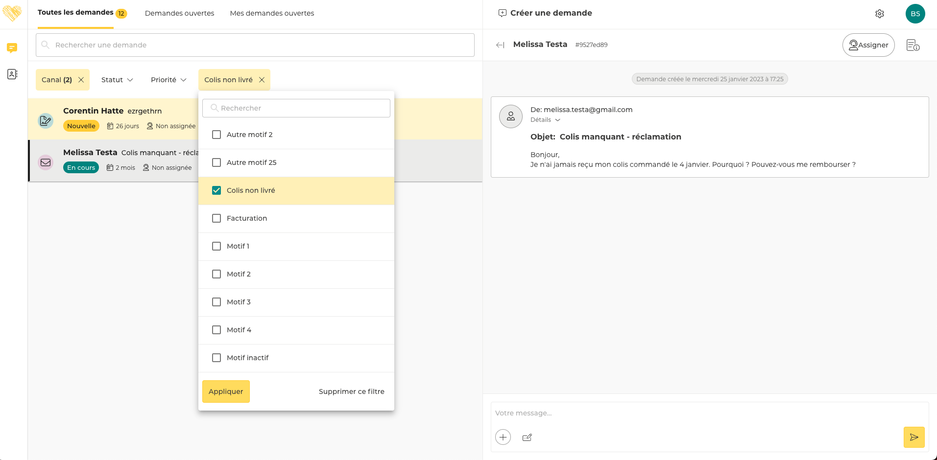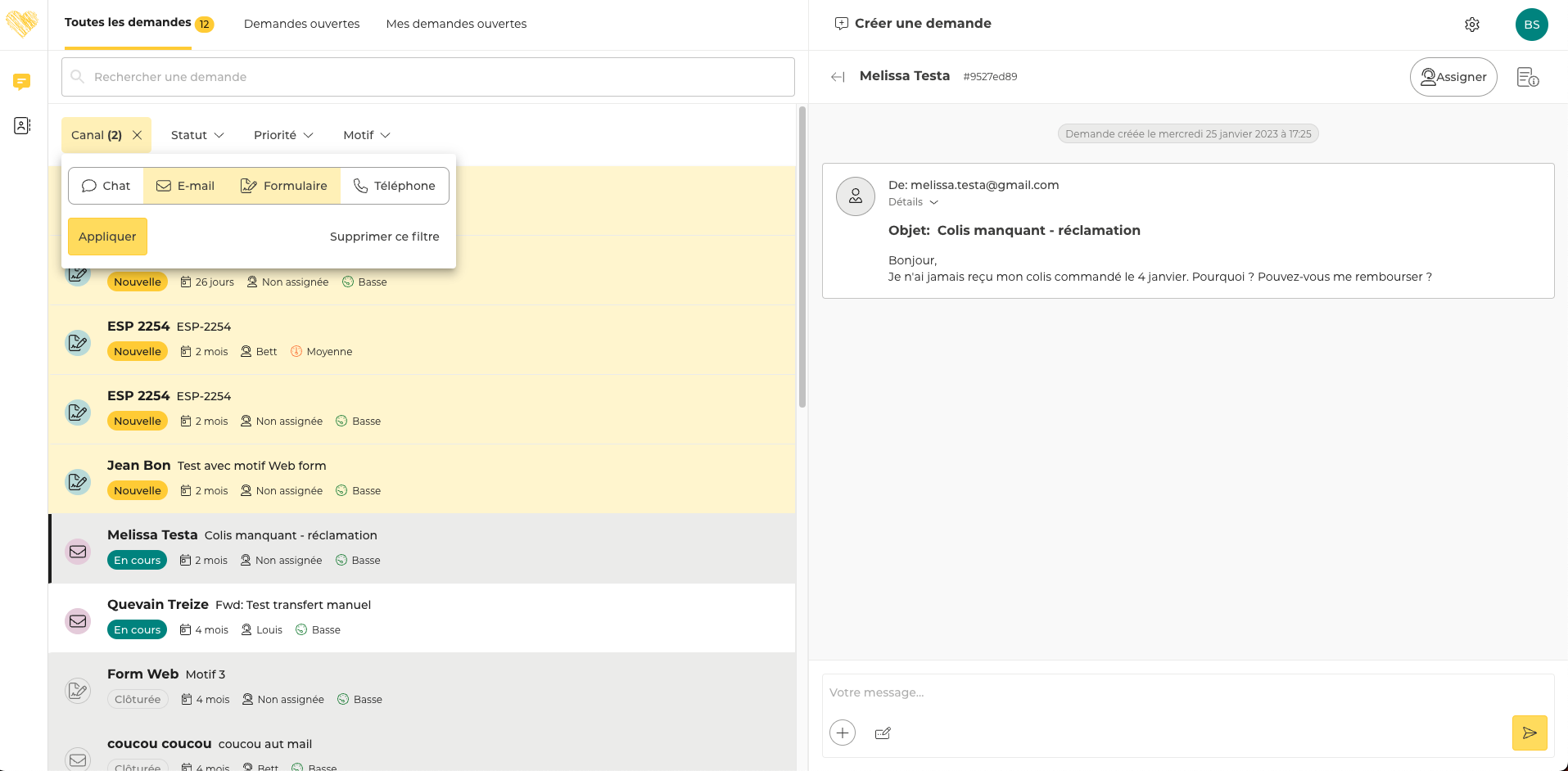 Seules les demandes dont le canal est Email ou Formulaire et dont le motif est Colis non livré sont affichées dans l’onglet Toutes les demandes.