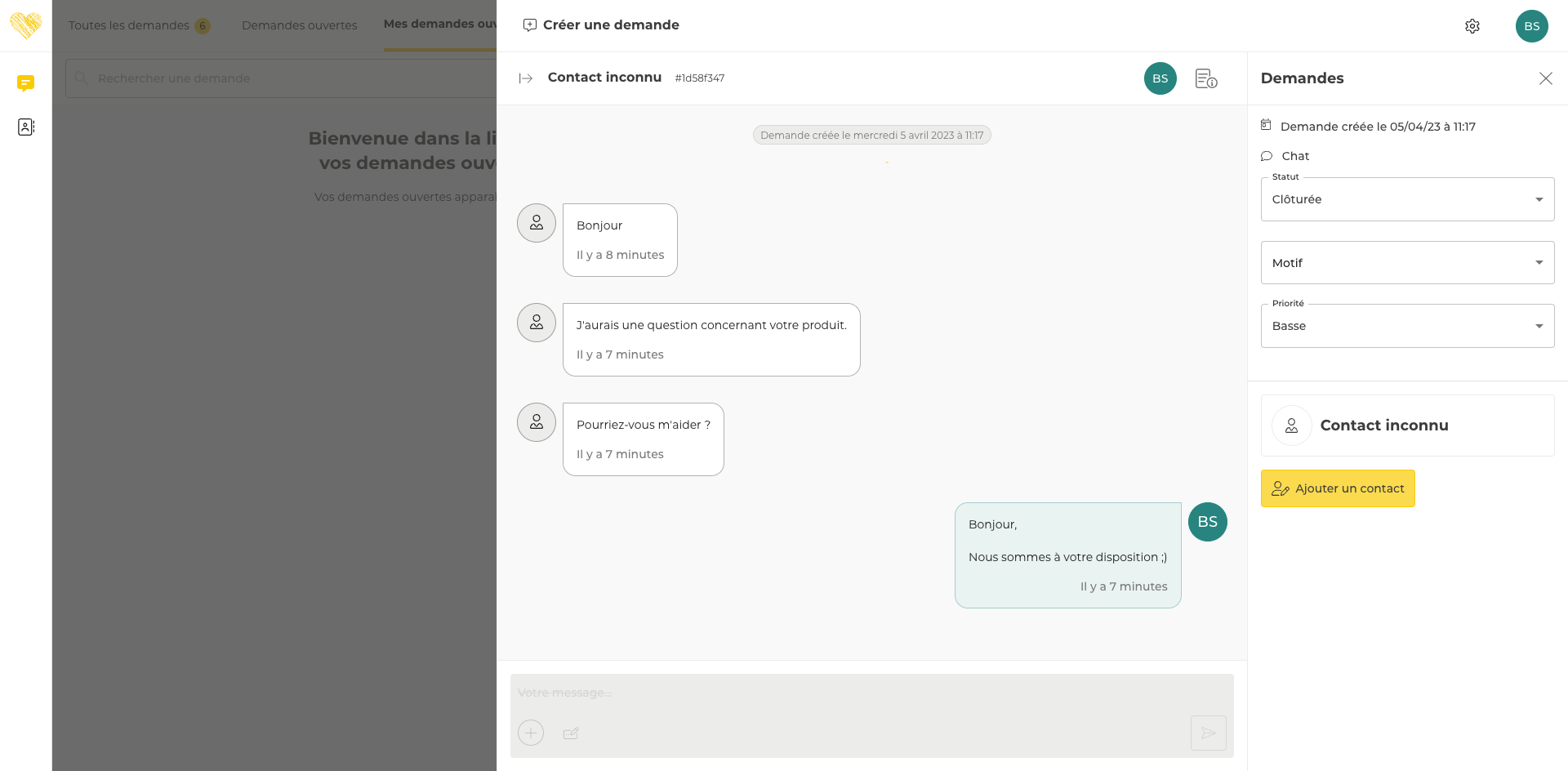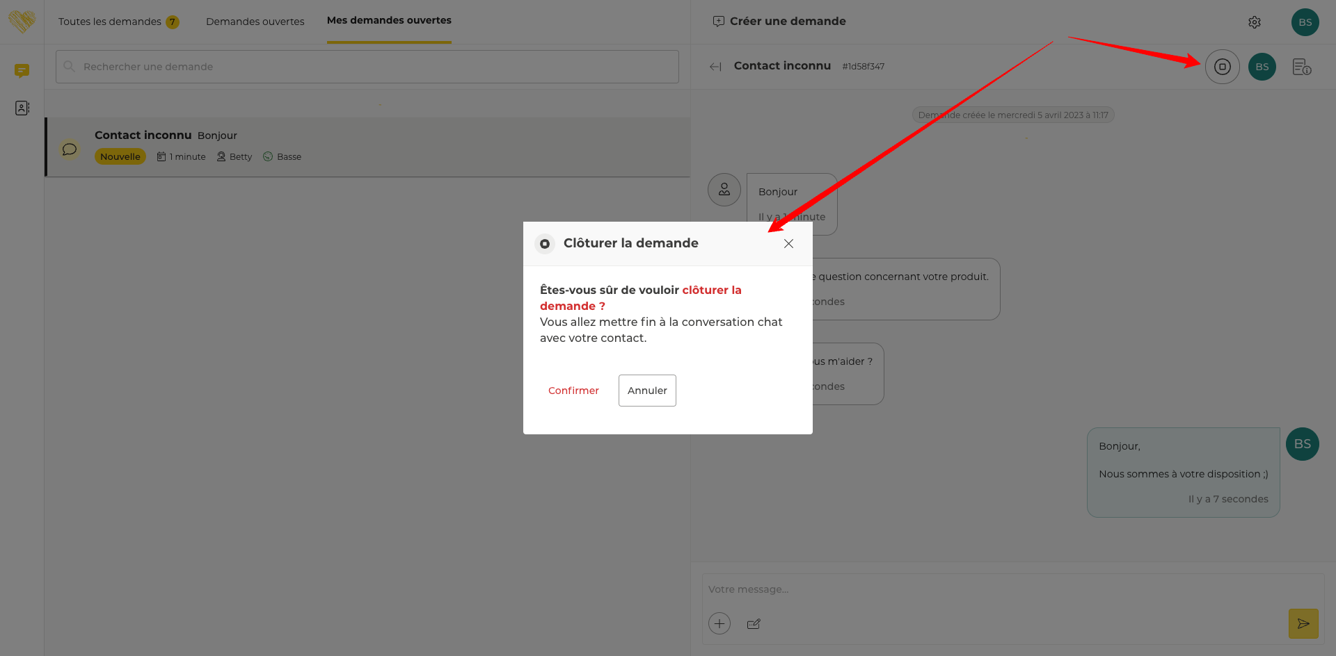 Sur les demandes en provenance du canal chat (conversation chat démarrée par un contact depuis votre easibox), les utilisateurs sont désormais en capacité de clôturer la conversation afin d’y mettre fin et ainsi permettre au contact de démarrer une nouvelle conversation si nécessaire.