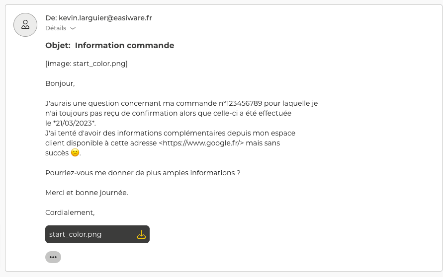Jusqu'à présent, seule la version texte des e-mails entrants était supportée par easiware Start. Un e-mail entrant ne contenant qu’une version HTML n’était donc pas interprété par l’application entrainant l’affichage d’un message vide dans la demande correspondante.