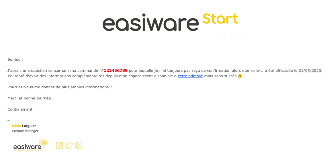 A venir dans une prochaine version d’easiware Start : permettre à l’utilisateur de continuer à échanger avec le contact (si ce dernier a été identifié) par e-mail.